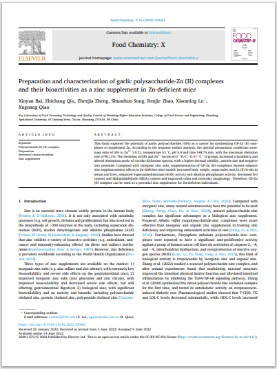 <div>&nbsp;</div> <div>【引用產品】:<span style="color: rgb(51, 153, 102);"><u><span style="font-size: medium;"><strong>zinc ion determination kit</strong></span></u></span></div> <div>&nbsp;</div> <div>【論文標題】:Preparation and characterization of garlic polysaccharide-Zn (II) complexes and their bioactivities as a zinc supplement in Zn-deficient mice</div> <div>&nbsp;</div> <div>【論文網址】:<u><strong><a href="https://www.sciencedirect.com/science/article/pii/S2590157522001596"><span style="color: rgb(255, 0, 0);">https://www.sciencedirect.com/science/article/pii/S2590157522001596</span></a></strong></u></div> <div>&nbsp;</div> <div>【影響因子】:5.182</div> <div>&nbsp;</div> <div>【反應物種】:Mouse</div> <div>&nbsp;</div> <div>【第一作者】:Xinyan Bai</div> <div>&nbsp;</div> <div>【通信作者】:Xiaoming Lu</div> <div>&nbsp;</div> <div>【發表時間】:2022-06-14</div> <div>&nbsp;</div> <div>【期 刊】:Food Chemistry-X</div> <div>&nbsp;</div> <div>【單 位】:山東農業大學食品科學與工程學院山東省高等學校食品加工技術與質量控制重點實驗室</div> <div>&nbsp;</div> <div>【實 驗】:ELISA</div> <div>&nbsp;</div> <div>【組 織】:serum</div> <div>&nbsp;</div> <div>【D O I】:10.1016/j.fochx.2022.100361&nbsp;<br /> <br /> <img src="/images/upload/Image/圖片1(5088).png" width="402" height="536" alt="" /></div>